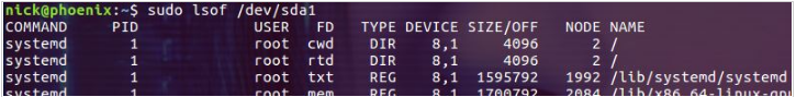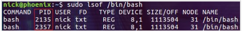 直接指定文件的名称作为 lsof 的参加就可以查看哪些进程打开了这个文件,下面的命令查询打开了 /bin/bash 文件的进程: