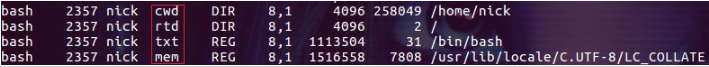 FD 列中的常见内容有 cwd、rtd、txt、mem 和一些数字等等。其中 cwd 表示当前的工作目录;rtd 表示根目录;txt 表示程序的可执行文件;mem 表示内存映射文件: