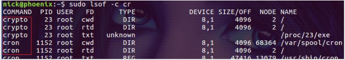 通过 -c 选项可以匹配进程运行的程序(可执行文件)名称。比如我们要查找以字母 cr 开头的程序打开的文件列表: