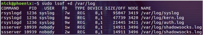 这里分两种情况,+d 选项不执行递归查询,只查找那些打开了指定目录以及指定目录下文件和目录的进程,比如: