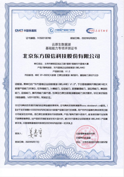 东方国信企业级数据湖(BELAKE)经过产品资料审核、测试报告审核、质询与答疑、集中评议等评审环节,获得了由来自中国信息通信研究院、清华大学、北京理工大学、北京邮电大学、工商银行、光大银行、民生银行、北京银行、中国移动、云上陕西、国新数据等单位专家组成的评审专家组的专业认可,顺利通过了“可信大数据”的云原生数据湖产品能力测试。