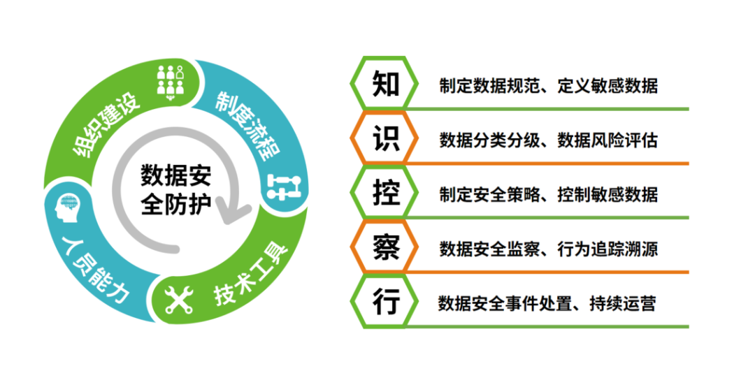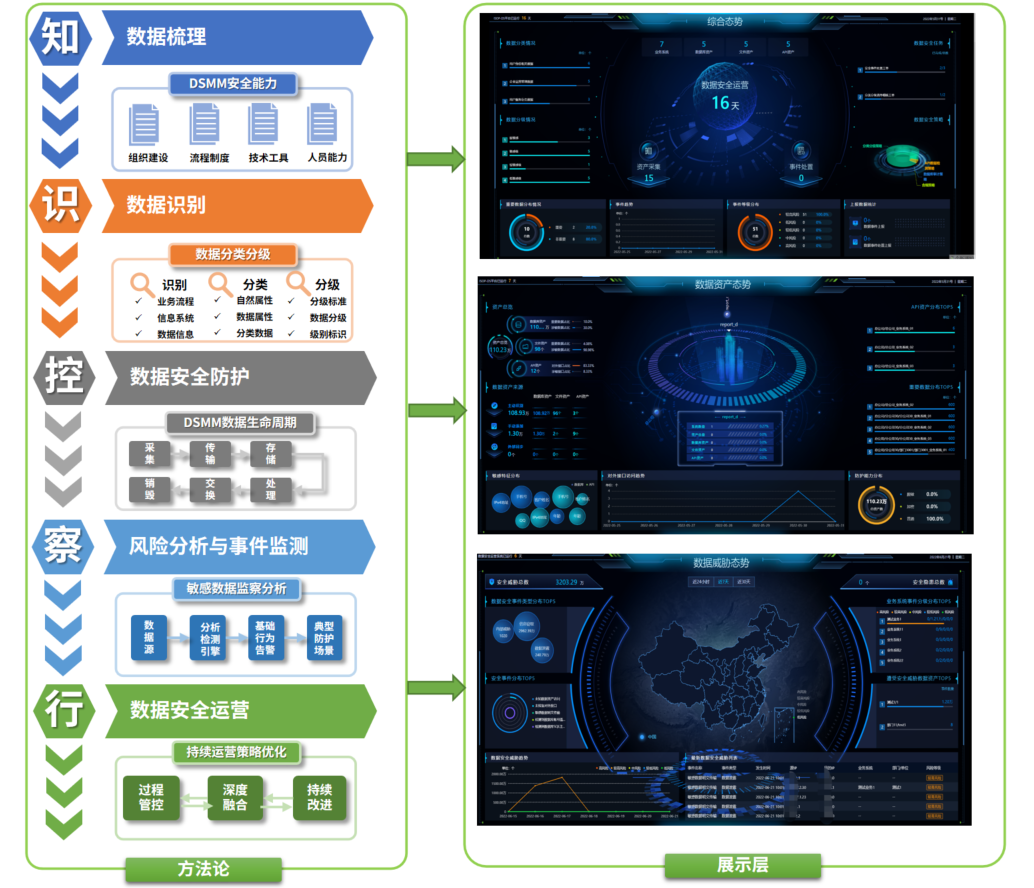 绿盟科技面对日趋复杂的网络安全态势以及不断增长的业务数据需求,提出了“知、识、控、察、行”数据安全方法论,并得到行业的广泛认可与落地实践。绿盟科技结合政府实际的数据安全防护需求,从终端数据到网络数据,从数据库安全到大数据安全,涵盖数据全生命周期各阶段过程,实现数据分类分级、风险评估、安全防控、追踪溯源、持续运营,全面掌控数据资产安全状况,有效应对数据安全风险与挑战,为构建以数据为关键要素的数字经济提供技术理论基础。