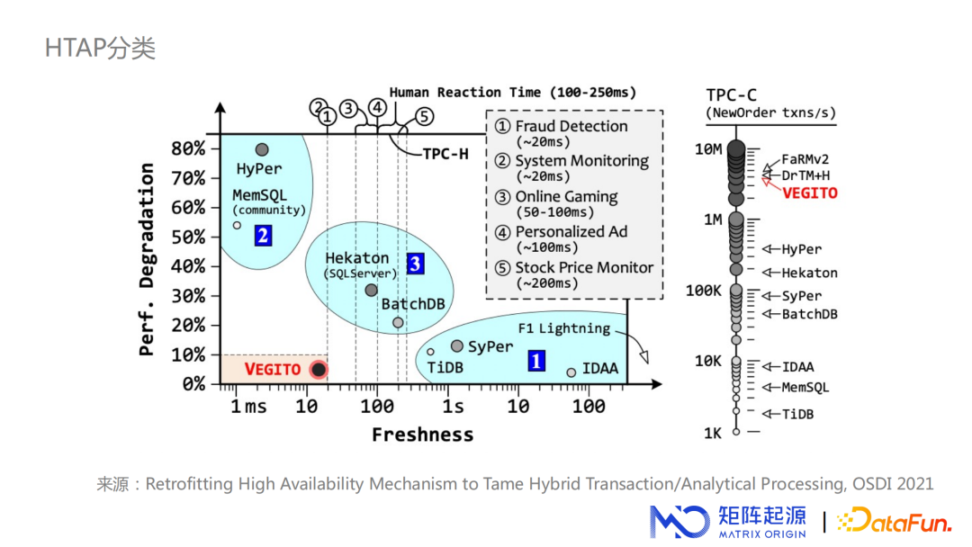 图中将可以HTAP融合分为两个维度:横轴是数据新鲜度,纵轴是TP transaction性能下降的维度。数据越新鲜,对transaction的影响越大、性能越差,各家厂商的trade off选择不同。