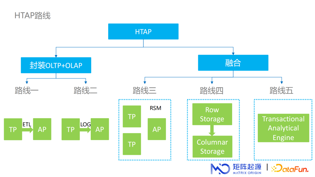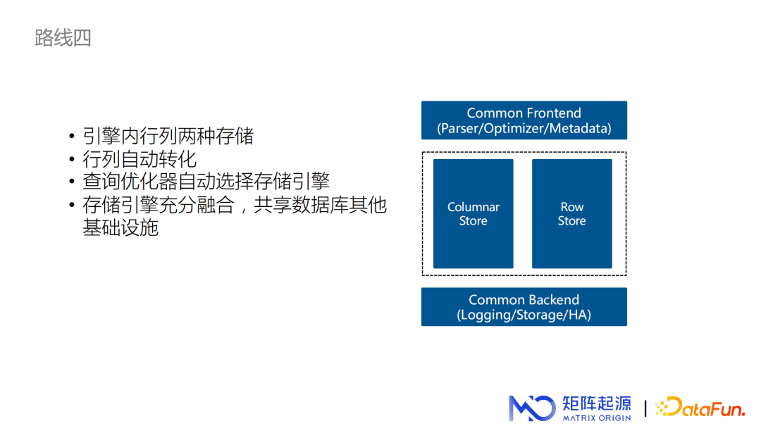 路线4将AP和TP进一步整合,在引擎内同时存在行列两种存储,行列间进行自动转化。查询引擎方面进一步优化,查询优化器自动选择存储引擎。存储引擎充分融合,共享数据库其他基础设施。