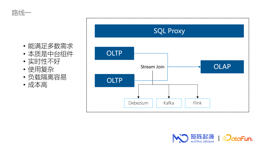 这个实现方案存在的问题是实时性不好、使用复杂、负载隔离容易、组件多、成本高。我们需要在整个系统前面实现SQL Proxy,将SQL请求区按AP和TP划分后发到不同存储引擎进行处理;如果不实现SQL Proxy,则需要中台的业务开发人员从业务逻辑入手对请求进行分类和拆解。