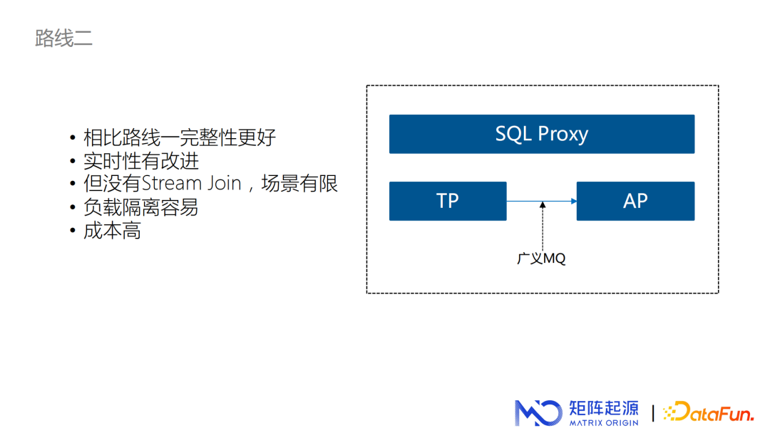 路线2的实现上相比路线1具有更好的完整性。通过“MQ”将TP的日志复制到独立的AP引擎中,从存储上看TP和AP是两套独立的存储系统。广义 MQ 指的是数据可以通过MQ同步,也可以通过其他创新的方式同步,比如大家都比较熟悉的TiDB HTAP就是这类实现,TiDB通过Raft Learner实现数据同步,比一般的MQ效果好很多。