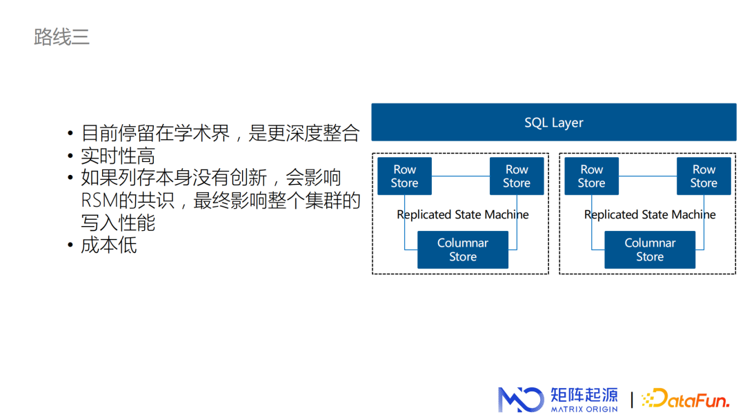 当前很多新数据库都是分布式数据库,分布式数据库都是高可用的。绝大多数提供高可用的方案都是采用复制状态机。从复制状态机的角度来说,我们没有必要把三个副本全部都交给一种引擎。我们可以拆出一个副本来,比如三副本中的两副本可以交给TP,就是行存;另一个副本我们会交给AP,也就是列存。