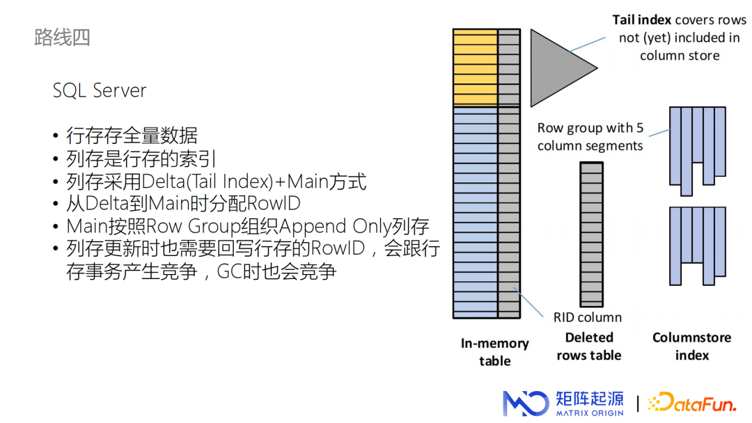 SQL Server是一个具有代表性的路线4实现方案。行存中存储全量数据,列存是行存的索引,使用Bw-tree在内存中存放行存数据。这里认为列存是行存的索引。