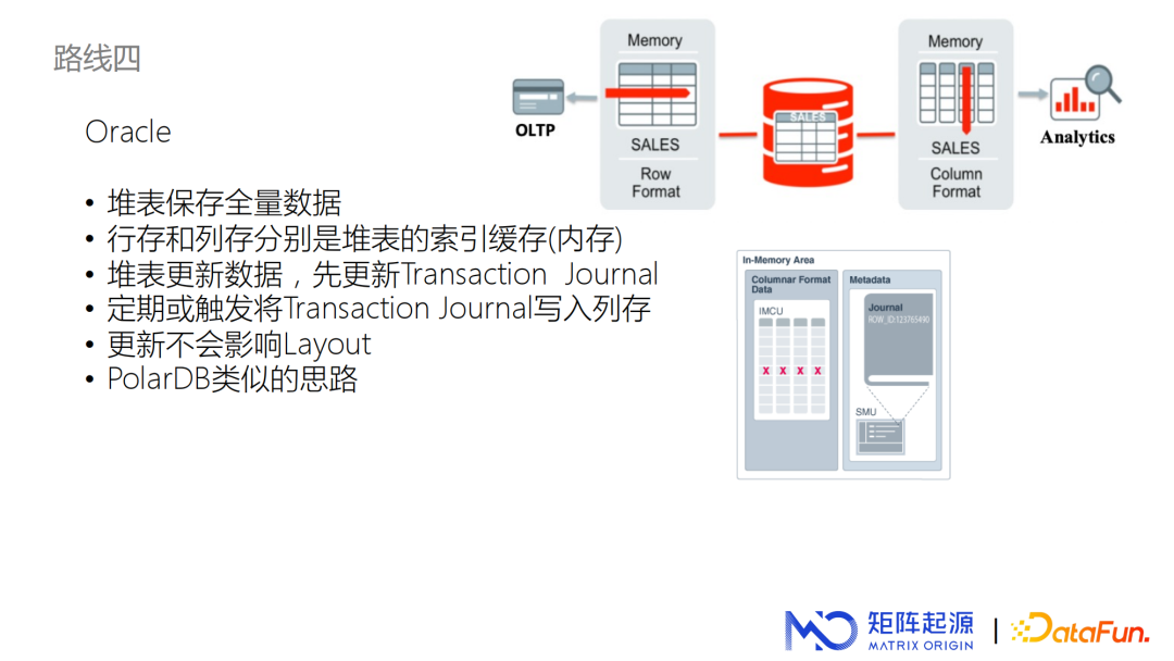 Oracle也是路线4的一种实现。Oracle采用堆表保存全量数据,行存和列存分别是堆表的索引缓存(内存)。堆表更新数据,先更新Transaction Journal,定期或触发将Transaction Journal写入列存。更新不会影响Layout,阿里云PolarDB也是类似的实现思路。