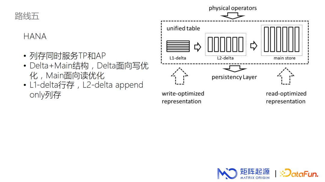 HANA也是路线5的一种实现。HANA使用列存同时服务TP和AP,采用Delta+Main结构,Delta面向写优化,Main面向读优化,L1-delta行存,L2-delta appendonly列存。