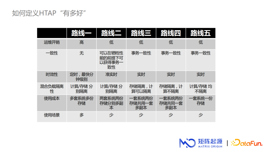 路线1由于使用多套系统、多分存储,使用成本高。路线2使用两套系统、两份存储,分别做高可用多副本,成本比路线1略低;路线3使用一套系统,两份存储,共用一套多副本,存储的冗余性更好;路线4使用两份存储,用一套多副本,存储开销比路线3更大;路线5开销最小,作为一个完整的数据引擎,使用一个引擎、一份存储、一套高可用方案,满足AP和TP两种负载。