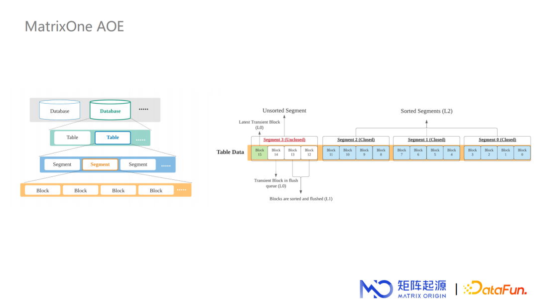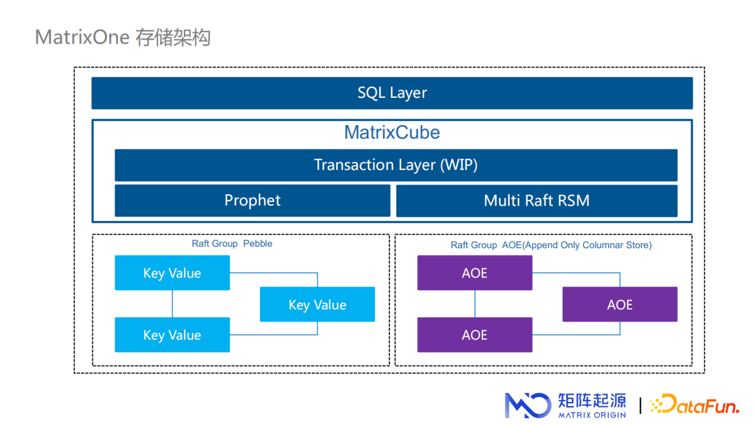 图中是MatrixOne的存储架构,中间是MatrixCube,是单独开源的。MatrixCube是一个复制状态机,其中有些存储调度的逻辑,可以用Raft机制管理不同存储引擎,当前我们使用开源的Pebble做行存存放Catalog信息,使用矩阵起源自研的AOE(Append Only Columnar Store)引擎做列存。目前我们在使用AOE引擎验证列存和复制状态机结合的可行性,接下来AOE存储引擎将进化到TAE,支持事务处理。