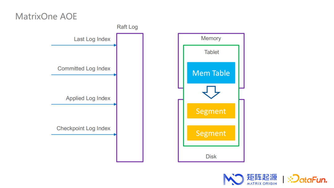 除了Raft Log的Last Log Index, Commit Log Index, Applied Log Index外,我们又增加了Checkpoint Log Index。它的作用是什么?MatrixOne的数据在内存中有Mem Table,Mem Table内存写满后落盘形成Block,这个时候需要记录水位信息,方便在整个系统崩溃被恢复时,能够根据 Raft Log 做回放、恢复数据。
