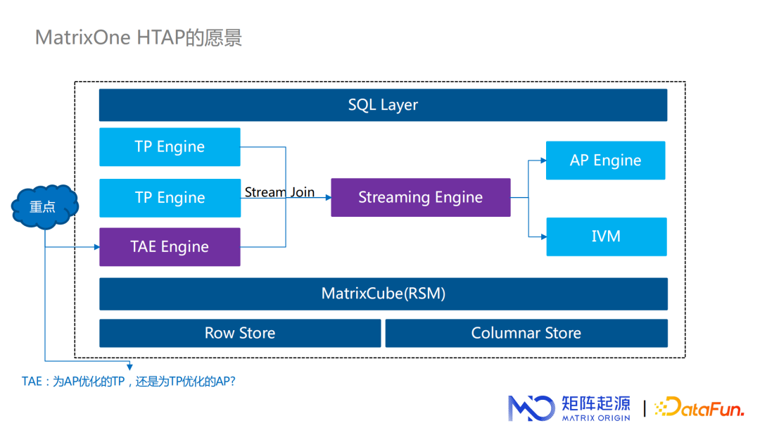 下图是MatrixOne关于HTAP的愿景。前面介绍的几种HTAP路线中,并没有完美的解决方案,我们的目标是实现One Size for Most的超融合HTAP数据库,这里边对应的是两个实现路径: