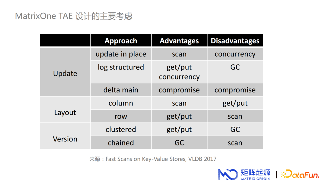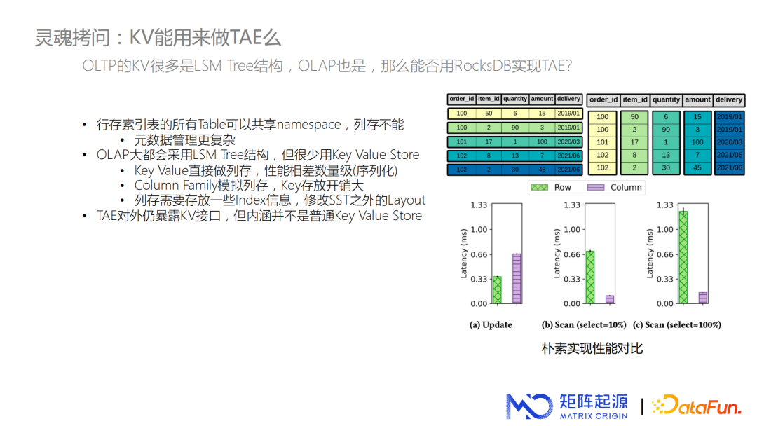 一个灵魂拷问是:是否可以用通常OLTP存储引擎中的KV来做TAE?已知这些KV很多是LSM Tree结构,且OLAP引擎很多也是LSM Tree结构,如Clickhouse。