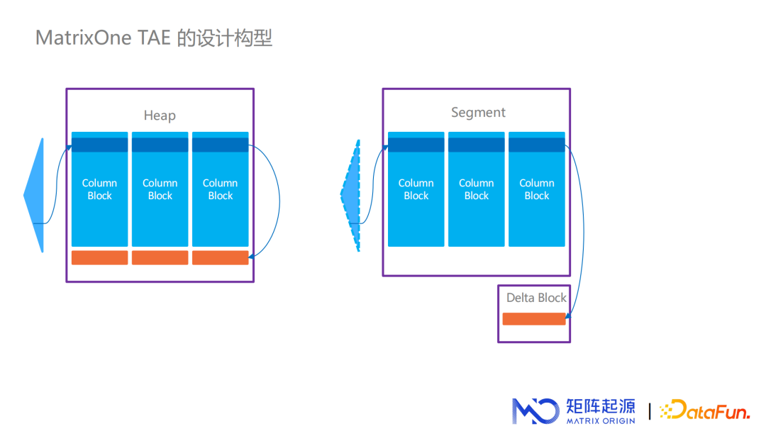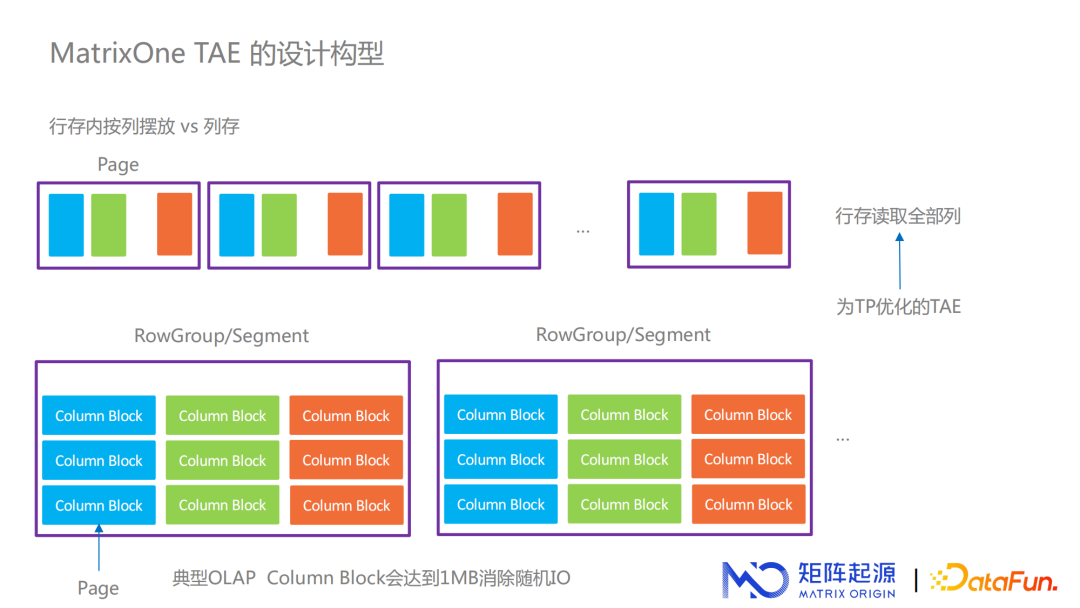 第二条,MatrixOne AOE进一步迭代,演化为可支持事务的分析性引擎——TAE(Transactional Analytical Engine),作为MatrixOne内部唯一的存储引擎(尽管MatrixCube具备管理多种存储引擎的能力)。从存储引擎实现的角度来说,这里有个选择的问题:TAE到底是为AP优化的TP,还是为TP优化的AP?我们希望是AP和TP兼顾,通过一个存储引擎的实现服务两个目标,事实上这并不难理解:一个列存结构,如果我们让所有列成为一个Column Family,那么数据的存储布局跟PostgreSQL里的堆表结构,并没有本质区别,而这可以服务TP型负载,如果让每个列都是独立的Column Family,那它就应该跟普通的OLAP没有区别。本质上,我们是希望通过存储引擎底层的灵活设计,实现对多种负载的支持,让用户在创建表的时候可以灵活指定。