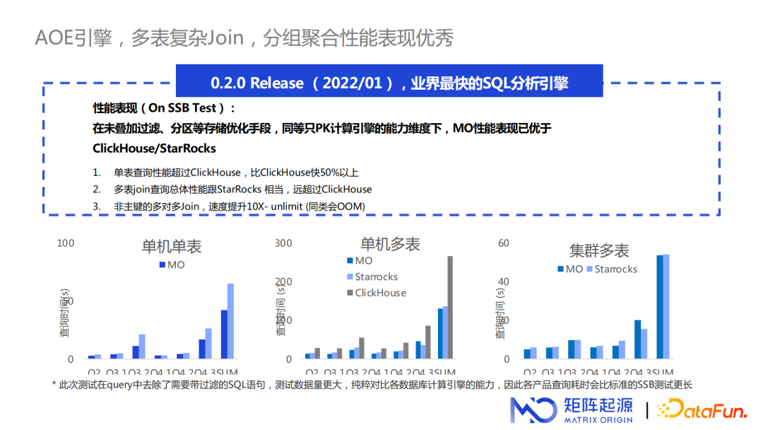 MatrixOne的AOE引擎支持多表复杂Join,分组聚合性能表现优秀。0.2.0 Release (2022/01),是业界最快的SQL分析引擎。