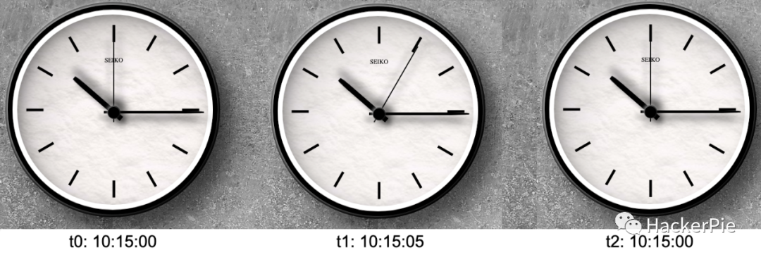 还是上面图片中的例子,假如在某一时刻,系统生成 ID,此时时间为 10:15:00,之后系统经历 5 秒后,在另一时刻 10:15:05,系统再次生成 ID,在这段时间里,系统一直使用的时钟为 1