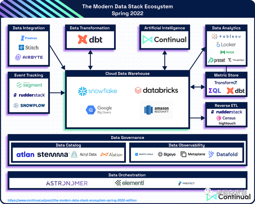 在今年4月份, Continual的Jordan Volz在medium自己的博客上新发表了一篇文章《Who's Who in the Modern Data Stack Ecosystem(Spring 2022)》,陈述了他对现代数据技术栈在2022年第一季度发展的一些看法,并且列出了相关生态的主要公司和值得关注的公司。