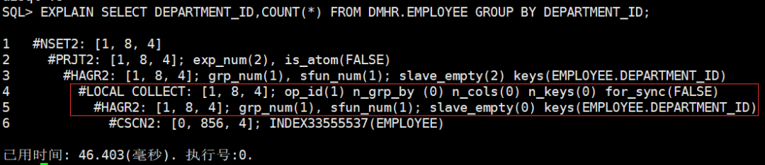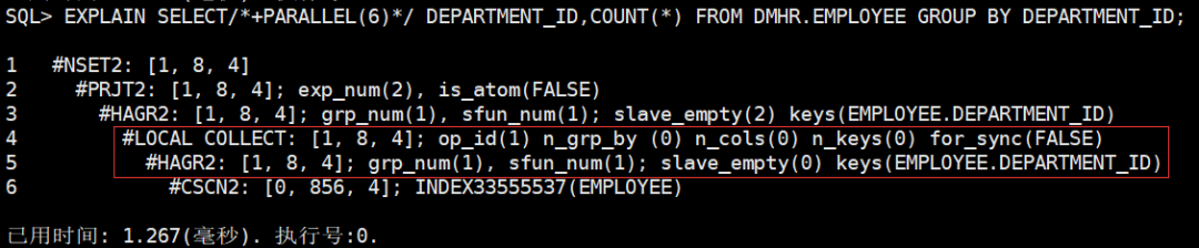 EXPLAIN SELECT/*+PARALLEL(6)*/ DEPARTMENT_ID,COUNT(*) FROM DMHR.EMPLOYEE GROUP BY DEPARTMENT_ID;