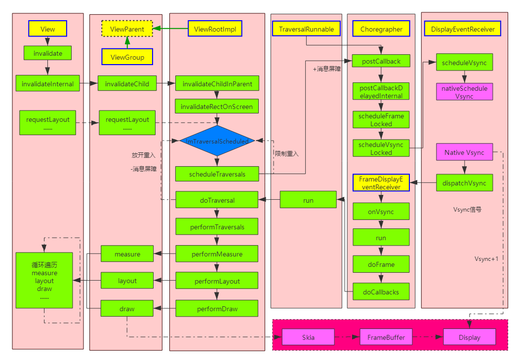内部通过一个 mTraversalScheduled 变量限制重入,所以一般情况 16ms 你不论调用多少次 invalidate 或者 requestLayout ,最终效果都是一样,并且你调用之后并不是立即就执行重绘,后面分析。这里还涉及到异步消息,之前分析过,不具体分析,简单来说就是往消息队列插入一条异步消息作为屏障,插入屏障之后消息队列的同步消息停止执行,直到该消息屏障移除后才恢复,主要就是为了保证优先级,毕竟交互响应是优先级最高的。这里还涉及到 Choreographer 编舞者的角色,主要是解决帧率不同步,掉帧问题,非本文重点,本文只分析下其内部对于 vsync 请求流程和回调时机。