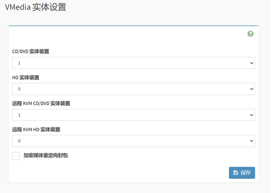 登录服务器BMC进行设置,选择【设置→媒体重定向→VMedia实体设置】,进入VMedia实体设置页面。 根据下图所示,设置相关参数,单击保存按钮。