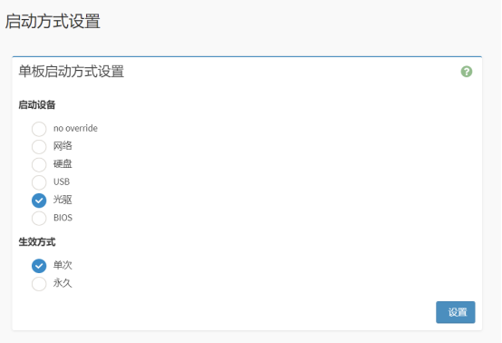 在BMC系统上,选择【设置→启动方式设置】,进入启动方式设置页面。 根据下图所示,设置相关参数,单击保存按钮。