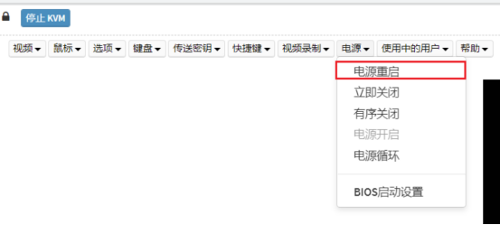 在KVM界面,选择【电源→电源重启】,如下图所示。