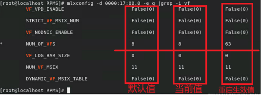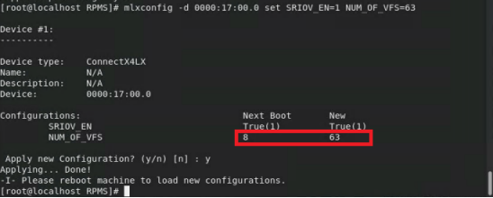 执行“mlxconfig -d businfo set SRIOV_EN=1 NUM_OF_VFS=63”命令,修改businfo对应网卡VF数量63,默认值是8,如下图所示。