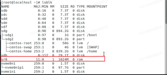Linux操作系统lsblk显示有sr0设备,需要关闭sr0,如下图所示。
