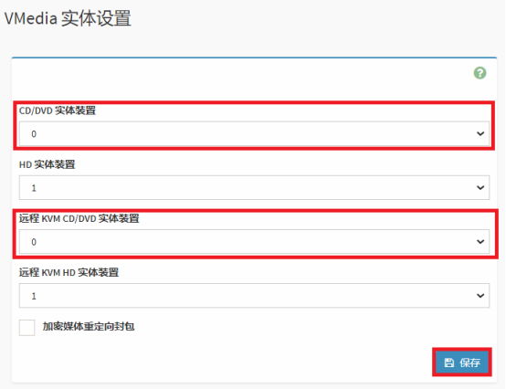 CD/DVD实体装置和远程KVM CD/DVD实体装置,选择0,单击保存按钮。