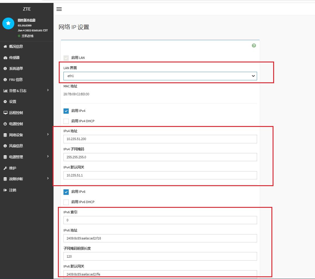 共享网口默认IP地址为128.0.0.10,255.255.255.0,将笔记本电脑本地网络改为128.0.0.5,255.255.255.0。将笔记本网口连接到服务器共享网口,网页输入https://128.0.0.10,输入账号密码(默认为zteroot/Superuser9!),即可登录BMC管理界面。 选择菜单[设置→网络设置→网络IP设置],LAN界面选择eth1,查看对应的IP地址即为BMC IP地址。 * eth0为共享口,eth1为iSAC管理口。