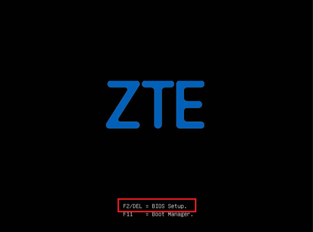 在服务器关机的状态下,连接键盘和显示器,长按电源按键4s关机,再按下电源按键启动服务器。 当显示器显示ZTE logo时,按下F2/Delete按键,进入BIOS系统。