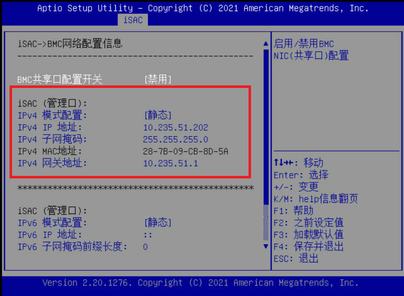 选择菜单[iSAC主菜单→BMC network configuration] ,进入BMC network configuration界面,查看iSAC口IP地址配置的当前值。