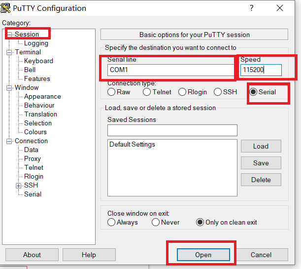 Serial line填入串口线使用的端口(设备管理器中端口一栏可查看),Speed填入115200,Connection type选择Serial,单击Open按钮。