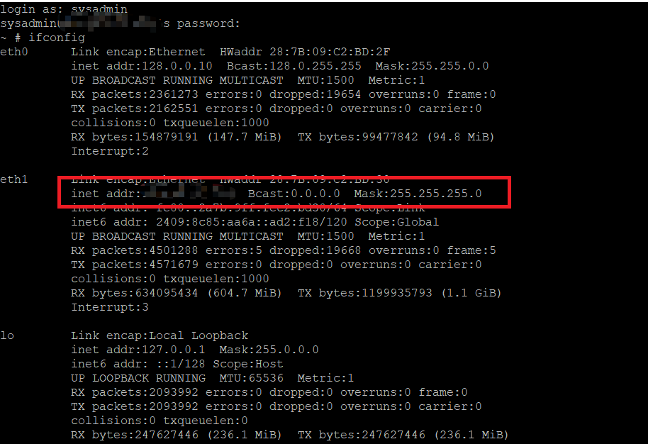 执行ifconfig命令,查询eth0和eth1对应的IP,eth1为对应的BMC的iSAC的地址。