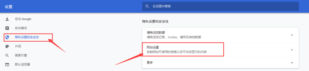 在设置窗口,单击左侧的隐私设置和安全性,之后在右侧选择网站设置。