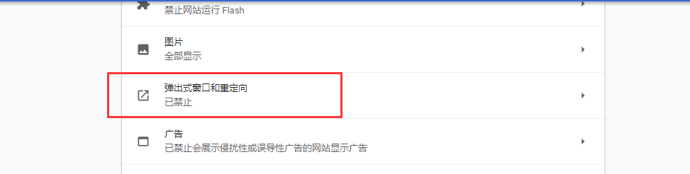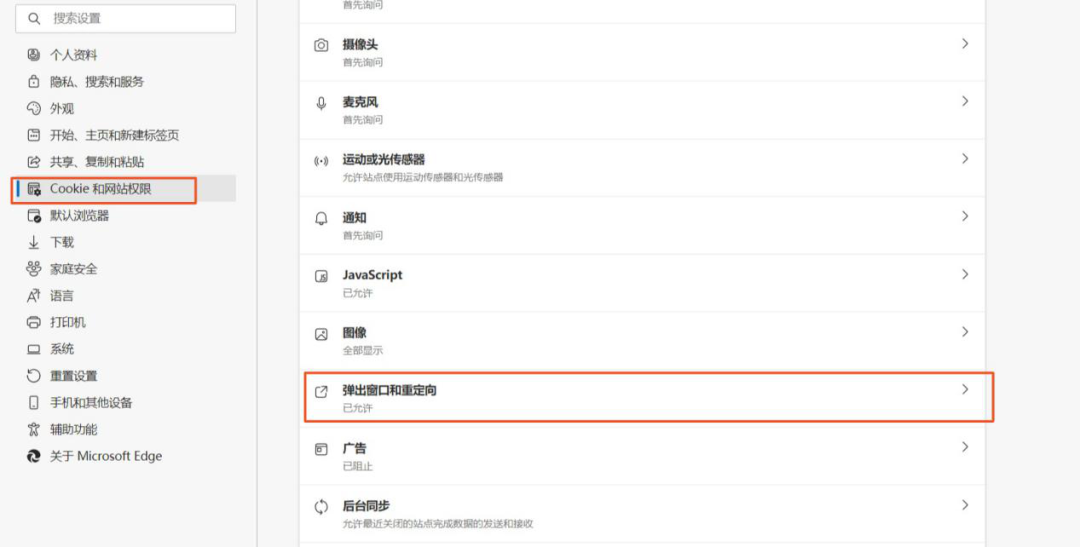 按钮。在弹出的菜单项中,选择Cookie和网站权限,之后在右侧选择弹出窗口和重定向。