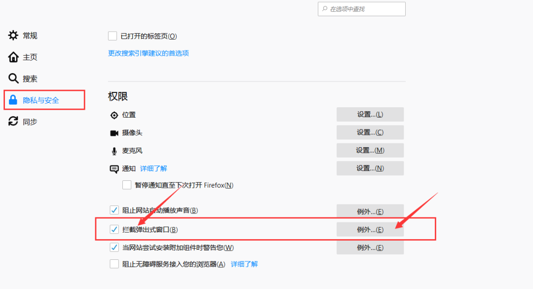 在左侧选择菜单隐私与安全,在右边找到下方的拦截弹出式窗口设置,将默认勾选的拦截弹出式窗口取消勾选。