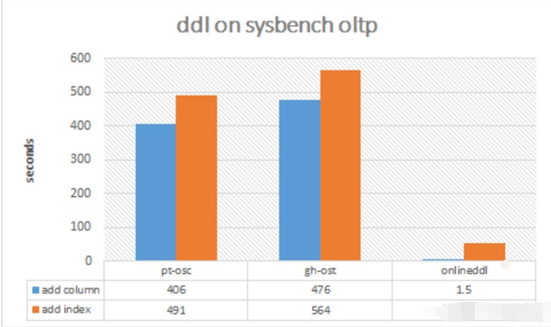 测试时,我们使用sysbench来模拟有无业务负载的场景。DDL操作考虑加列和加索引这两种。测试数据量为1k万条记录。测试结果如下。