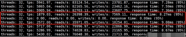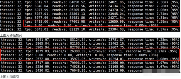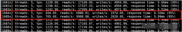 Online DDL执行期间对业务负载影响较小,从6k降为5.8k左右。但在切换阶段会出现秒级地停写情况,如下所示: