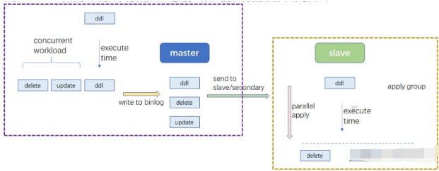主库上ddl和dml可以并发执行,在group commit阶段依次写入到binlog文件中,这些binlog传到从库上,由并行复制的worker线程回放。