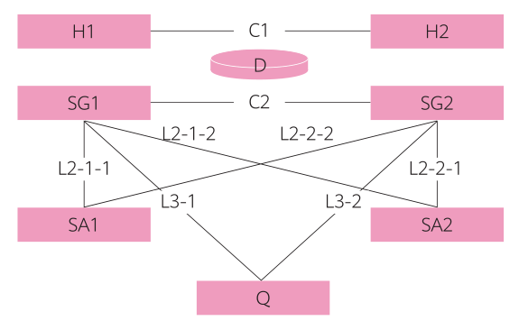 当C1出现故障的时候,如果是数据库双活集群(例如Oracle RAC),那么两个节点在网络上失去的仲裁资源是同等的,接下来需要判断的是双活所持存储仲裁资源的状况。但是问题来了,这个时候C2、L2-1-2、L2-2-2同时发生故障,存储层也处于需要仲裁的状态,而存储的仲裁需要根据Q的判断来完成。也就是说当仲裁中心仲裁之后,存储的状态才会到达正常稳定的状态,磁盘资源情况才会明确。当磁盘资源情况明确之后,上层数据库集群的磁盘仲裁资源才可以作为判断依据,然后数据库集群才会有仲裁的可能性,最终整个容灾系统才有可能到正常稳定状态。