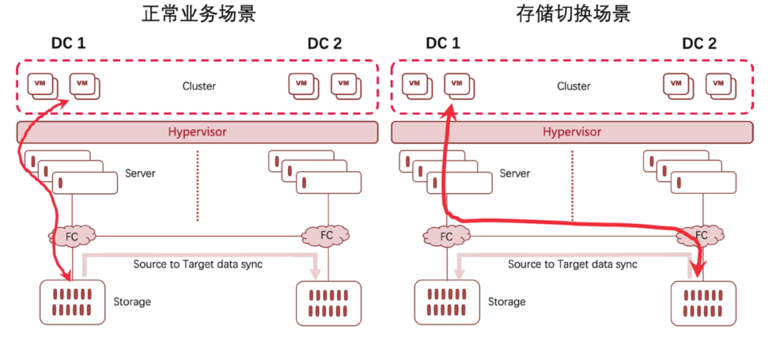 SA1&SA2表示底层存储磁盘阵列,通过存储网络分别与SG1和SG2相连接。