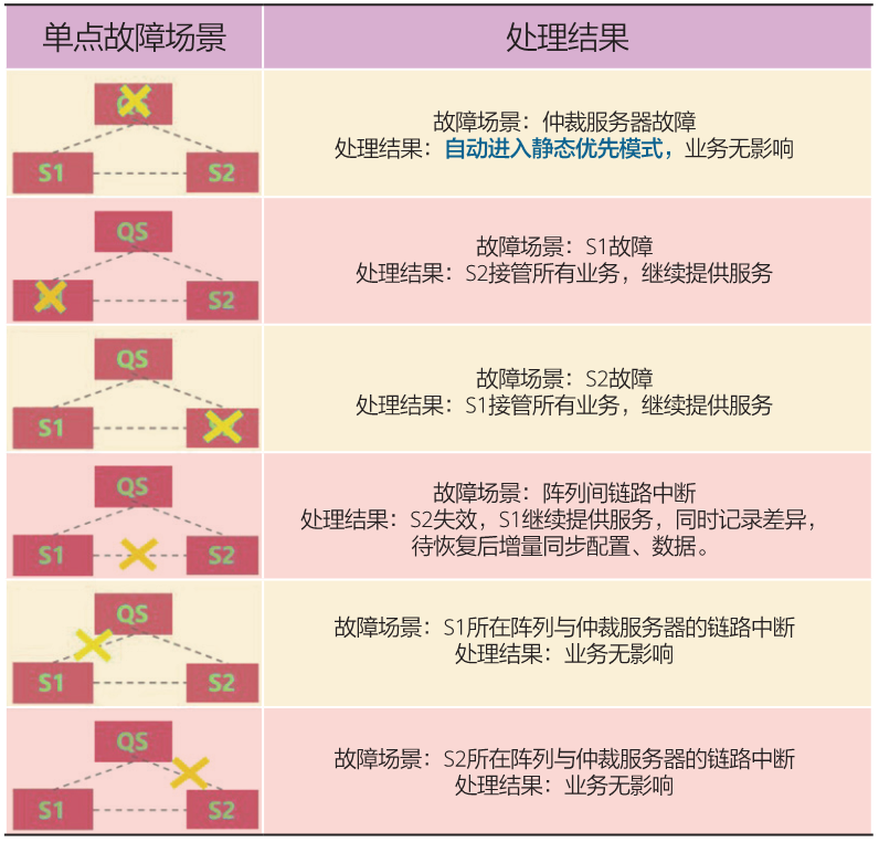 1)当仲裁服务器本身出现故障时,S1和S2存储能够持续对外提供读写服务,主机业务无任何影响,此时由于缺少了仲裁服务器,将自动进入静态优先模式;