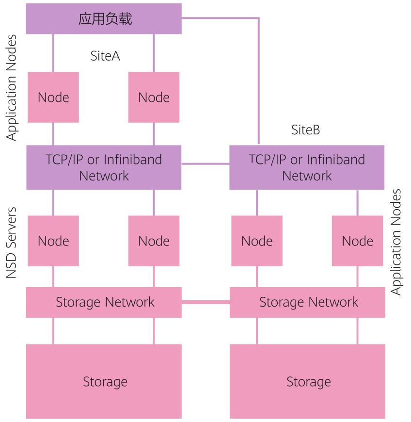 将SiteA的NSD Server与Application Node分置于不同节点,SiteA和SiteB节点全部作为GPFS客户端,两个站点的节点GPFS I/O读写路径和性能一致。
