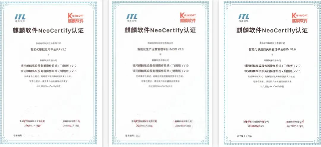 在本次智能化基础应用平台iAP、智能化生产运营管理平台iMOM、智能化供应商关系管理平台iSRM适配过程中,麒麟软件技术团队向海通安恒提供了全方位的支撑,包括在系统基础服务搭建、网络适配、模块适配、以及各个测试环节等方面都提供了针对性的建议与支持。这些建议和支撑使项目能在短时间内顺利地完成迁移与适配。智能化基础应用平台iAP、智能化生产运营管理平台iMOM、智能化供应商关系管理平台iSRM严格按照银河麒麟高级服务器操作系统适配标准完成适配评审,系统各项功能都通过了样例测试达到预期目标,系统的性能和稳定性都在预期范围或高于预期。
