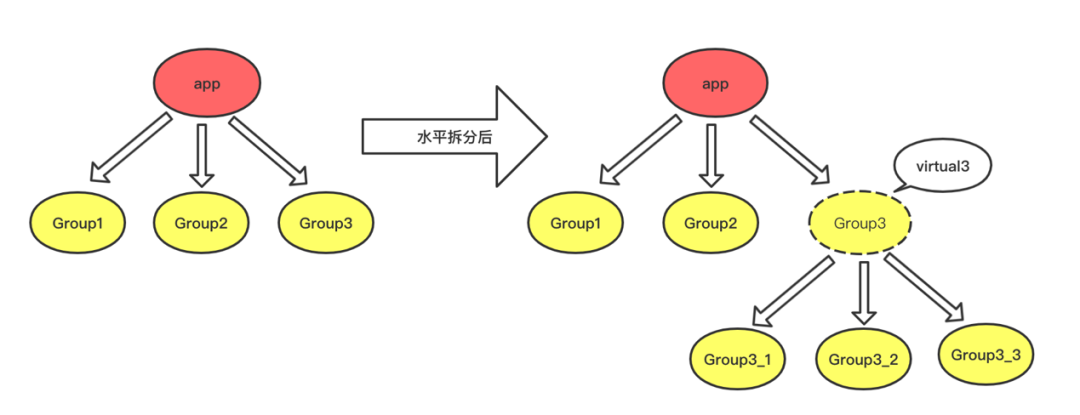 如上图所示,将树形结构从一层拓展成二层,如果继续拆分新的叶子Group,则可以将树形结构拓展到三层,拆分方案可以支持到十层。叶子 Group是物理分片,直接对应的 Redis 实例,分支 Group 是虚拟分片,当Hash 命中到分支 Group 后,并没有找不到对应的Redis实例,需要再继续向下寻找,直到找到叶子 Group 为止。