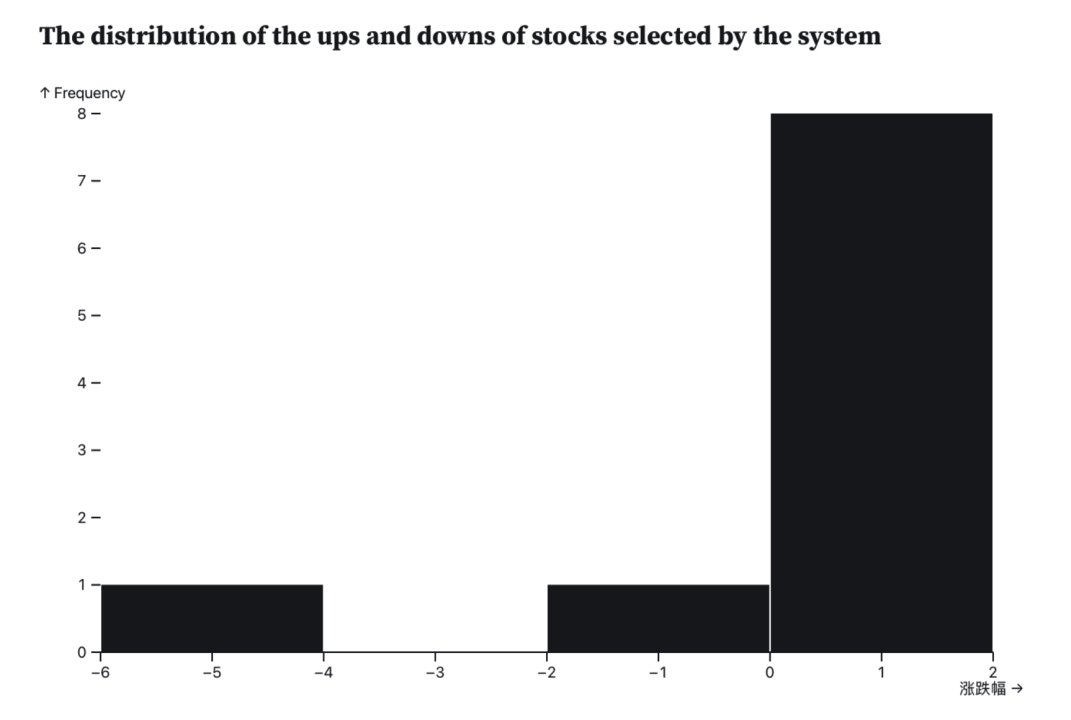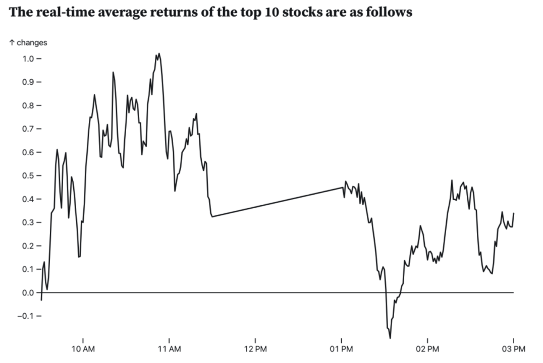 实时展示了选出的10个股票在日内平均的收益走势情况The distribution of the ups and downs of stocks selected by the system
