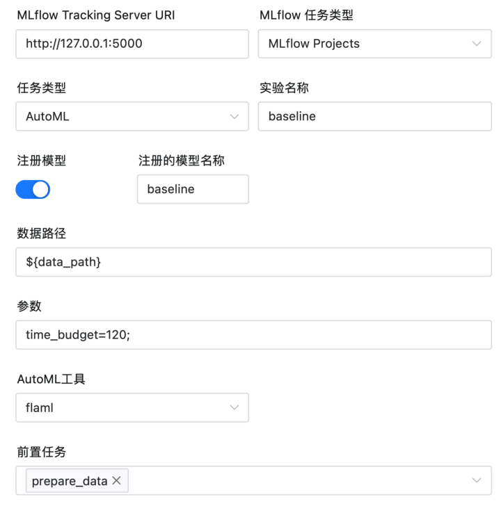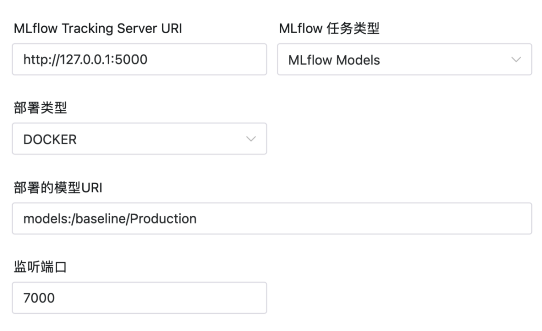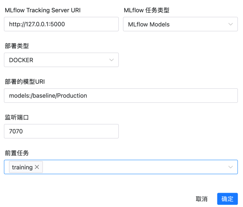该任务类型为MLflow任务类型,由Apache DolphinScheduler内置提供,可以部署MLflow服务中心的模型。